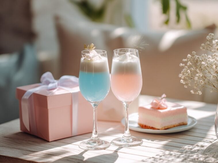 Are you planning on unveiling your little one’s gender during the shower? The Big Surprise baby shower cocktails do double duty as the big reveal and icy-cold refreshments. Bring a flair for the dramatic by adding either pomegranate juice or blue curacao to a gin-based fruity concoction. Then, watch your guests’ eyes light up when your blender answers the question they’ve been dying to know the answer to.