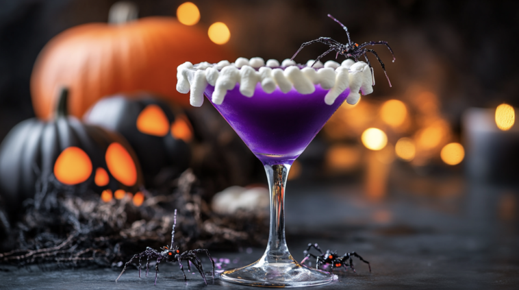 The Blackberry Widow’s Kiss is a spooky cocktail that blends bold flavors with a haunting look, making it perfect for Halloween parties or festive gatherings. This drink starts with blue raspberry vodka, which gives it a fruity base, while fresh lemon juice adds tartness and orange liqueur provides a smooth citrus balance. A drop of purple food coloring transforms the cocktail into a deep, eerie shade that fits the holiday theme. To complete the presentation, a marshmallow web garnish is stretched across the glass, creating a chilling effect. With its flavor and dramatic style, this cocktail is sure to impress.