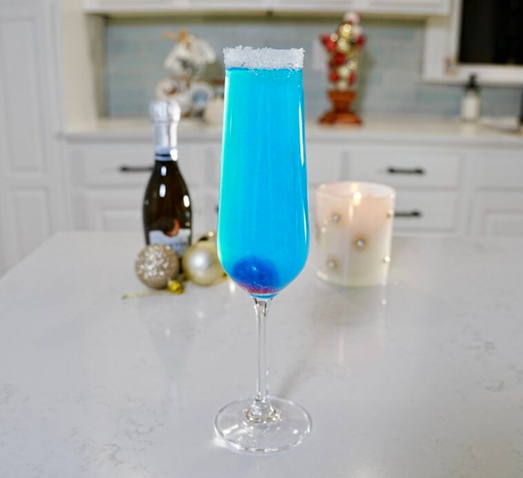 If you use less champagne, the drink will be stronger. A fuller pour makes the Blue Midnight Kiss lighter and more bubbly.