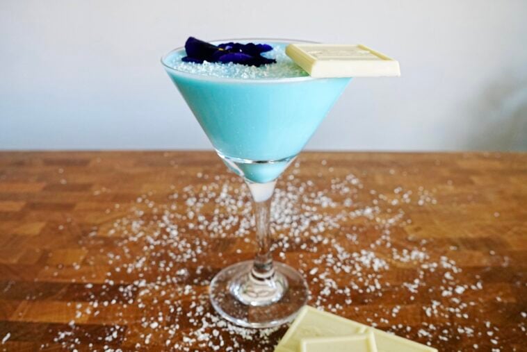 - Mix the Cocktail: In a shaker, combine white chocolate liqueur, vanilla vodka, blue curaçao, and heavy cream.