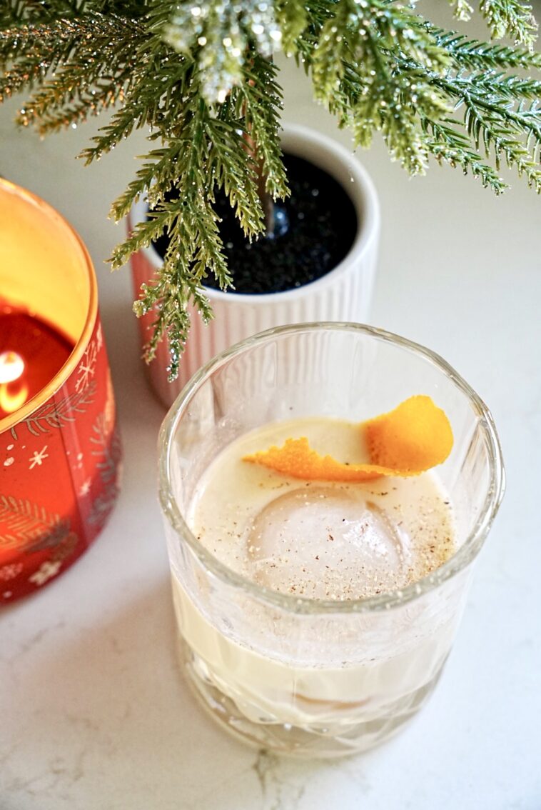 This drink is best served fresh, but you can prep components ahead. Keep eggnog chilled until mixing. Pre-cut orange peels and store in the refrigerator. Large ice balls can be made a day ahead and kept frozen until serving.