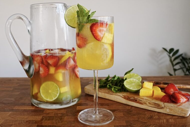 Fresh fruit is key here. Strawberries and mango add natural sweetness, while lime and lemon slices brighten the overall flavor.