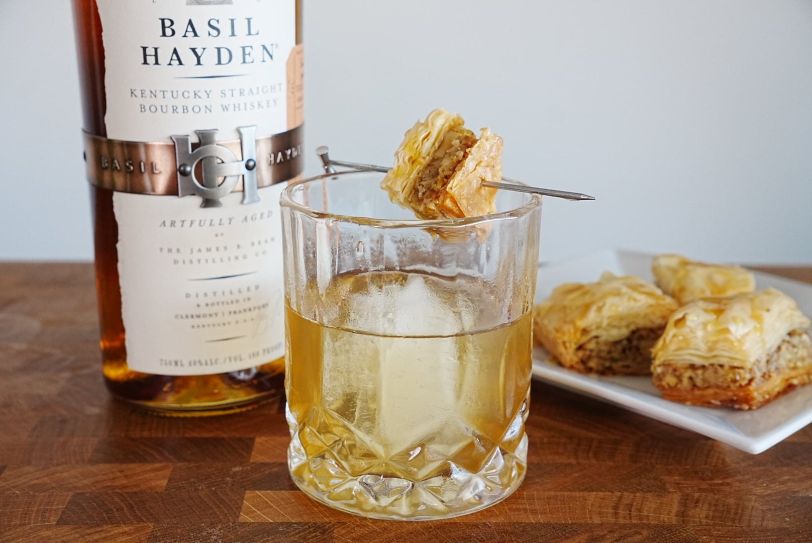 Garnish with a small piece of walnut baklava on a cocktail pick. For an easy option, grab walnut baklava from the dessert section at a local Mediterranean spot and cut a small triangle for the garnish.